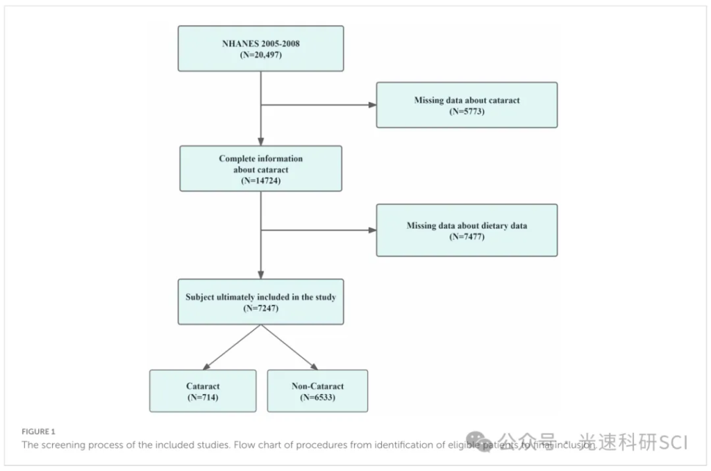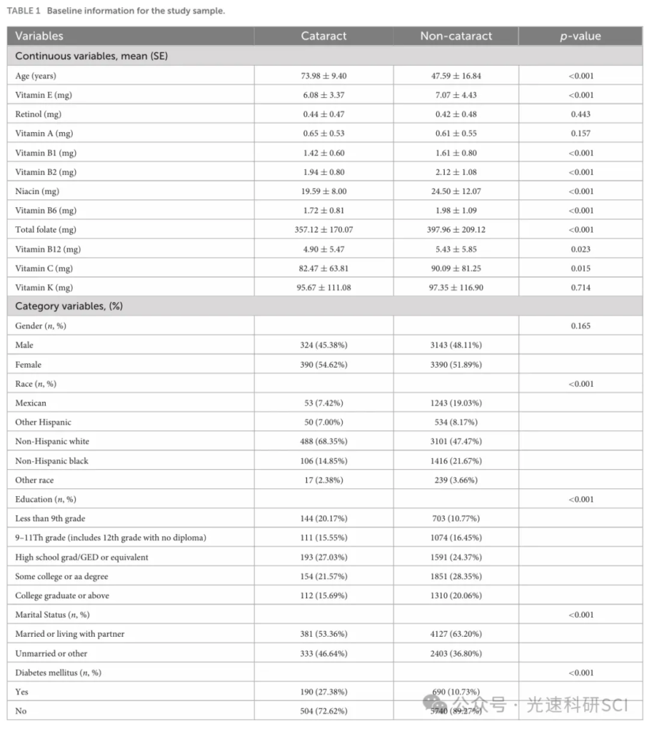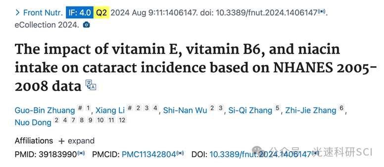 今天给大家分享一篇在 2024年8月发表在《Front Nutr》(2区,IF=4.0)的文章。本文这项研究利用了美国国家健康和营养调查(NHANES)2005–2008年的数据,探讨维生素 E、B6 和烟酸的饮食摄入量与白内障发病率之间的相关性。