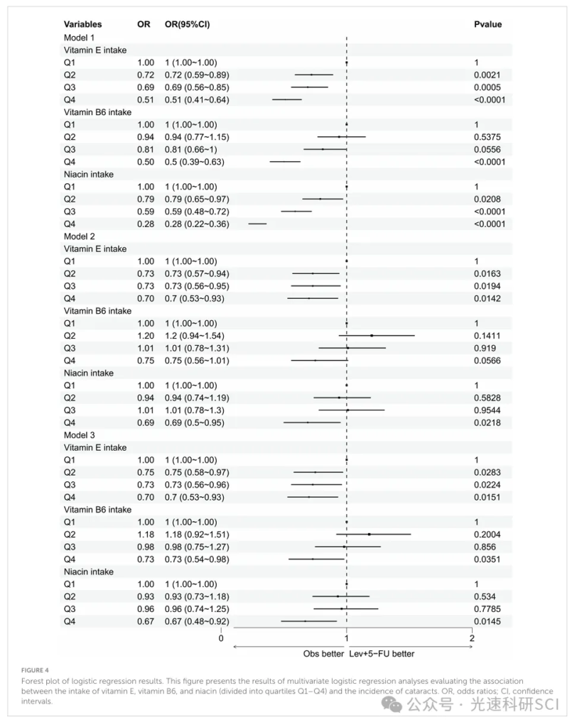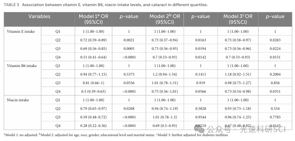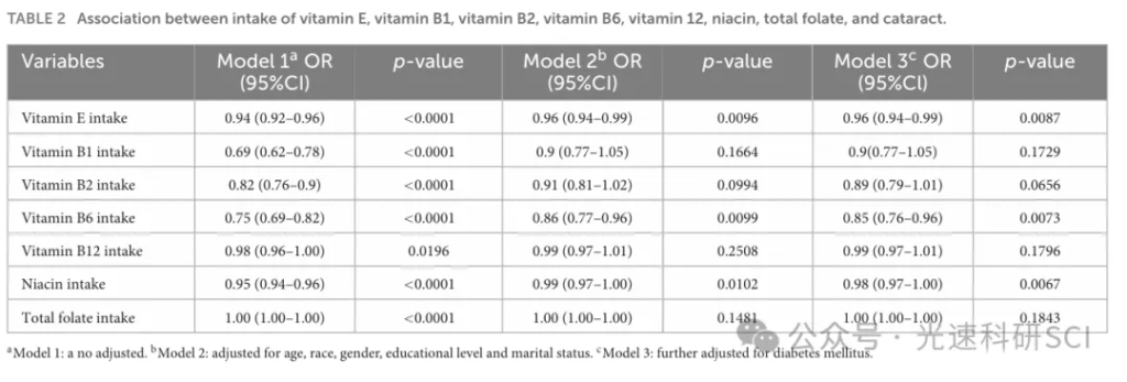 文章题目:The impact of vitamin E, vitamin B6, and niacin intake on cataract incidence based on NHANES 2005-2008 data