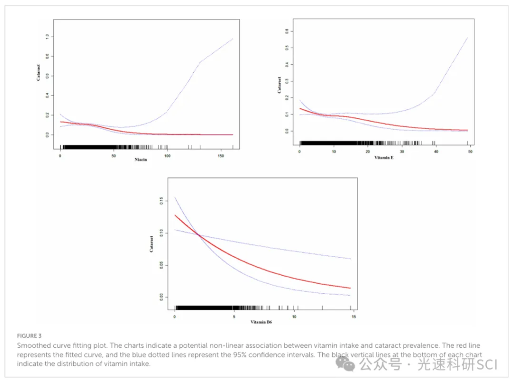 结果解读:我们的分析使用 NHANES 2005-2008 周期的数据,本分析集中于 7,247 名受试者,排除了因饮食或白内障数据不完整而导致的受试者。发现维生素 E、B6 和烟酸的摄入量与白内障发展风险之间存在显著的负相关。具体而言,上四分位数中维生素 B6(OR = 0.85,95% CI = 0.76-0.96,p = 0.0073)和烟酸(OR = 0.98,95% CI = 0.97-1.00,p = 0.0067)摄入量较高与白内障发生可能性降低显著相关。维生素 E 摄入量显示不同摄入水平的白内障风险一致降低(OR = 0.96,95% CI = 0.94-0.99,p = 0.0087),表明存在非线性负相关性。
