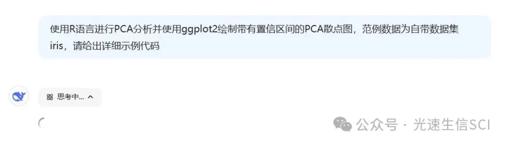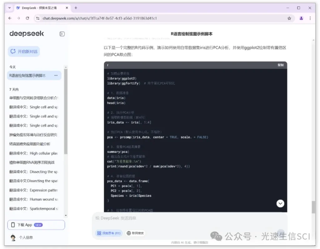 首次操作时请激活”开始对话”功能,随后系统将引导您进入作业上传界面。新用户需先完成账号注册流程,在平台提供的多个服务模块中优先勾选”智能解析(R1)”模式。完成基础设置后,您可直接向深度求索系统发出指令,请求其提供包含主成分分析算法实现及基于ggplot2可视化库的PCA二维坐标图完整案例代码。具体操作流程如下所示: