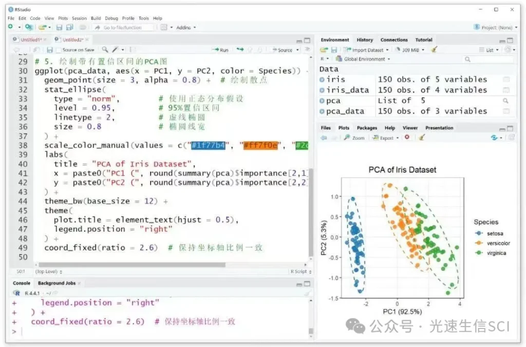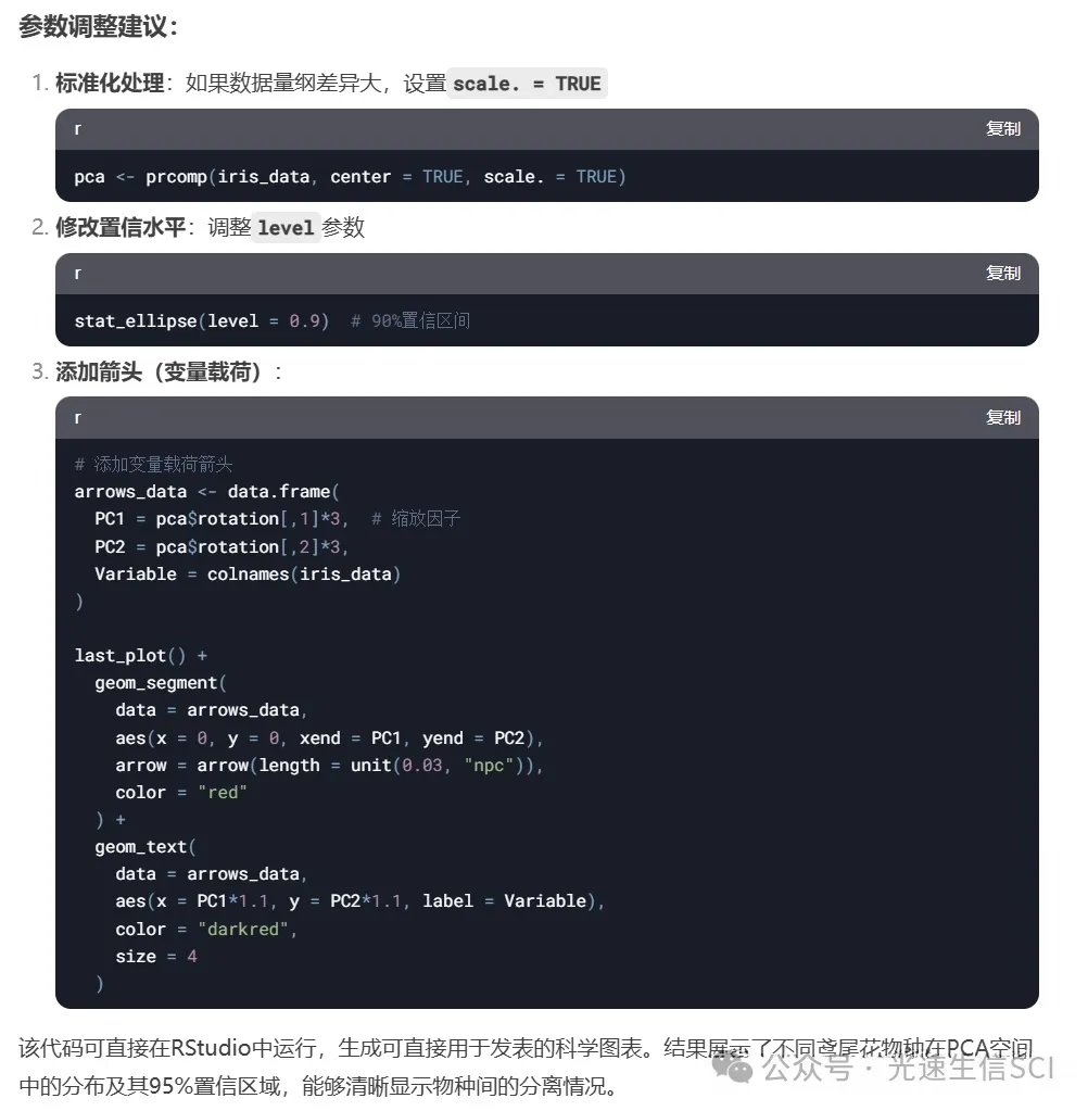 请通过以下步骤在R环境中执行主成分分析并生成可视化图表:首先定位到代码区域的顶部工具栏,选择”复制”功能键完整获取由DeepSeek平台输出的程序脚本。将已复制的代码内容完整转移至Rstudio的脚本编写界面后,执行完整的分析流程。