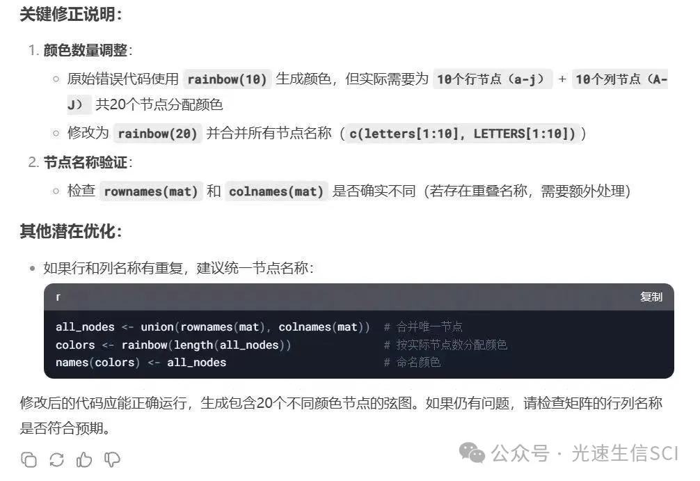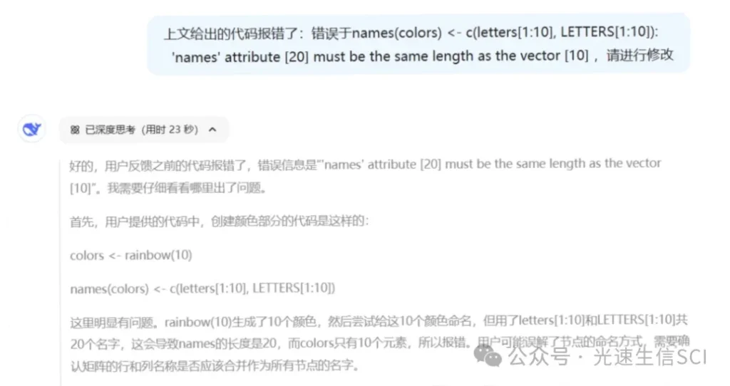 从之前的案例可以发现,DeepSeek平台输出的编程解决方案通常表现优异。然而实际应用过程中仍可能遭遇异常状况,比如当尝试通过DeepSeek获取绘制弦形图的R脚本时,尽管完整复制了系统提供的代码片段并导入RStudio平台运行后,控制台却意外返回了错误提示。