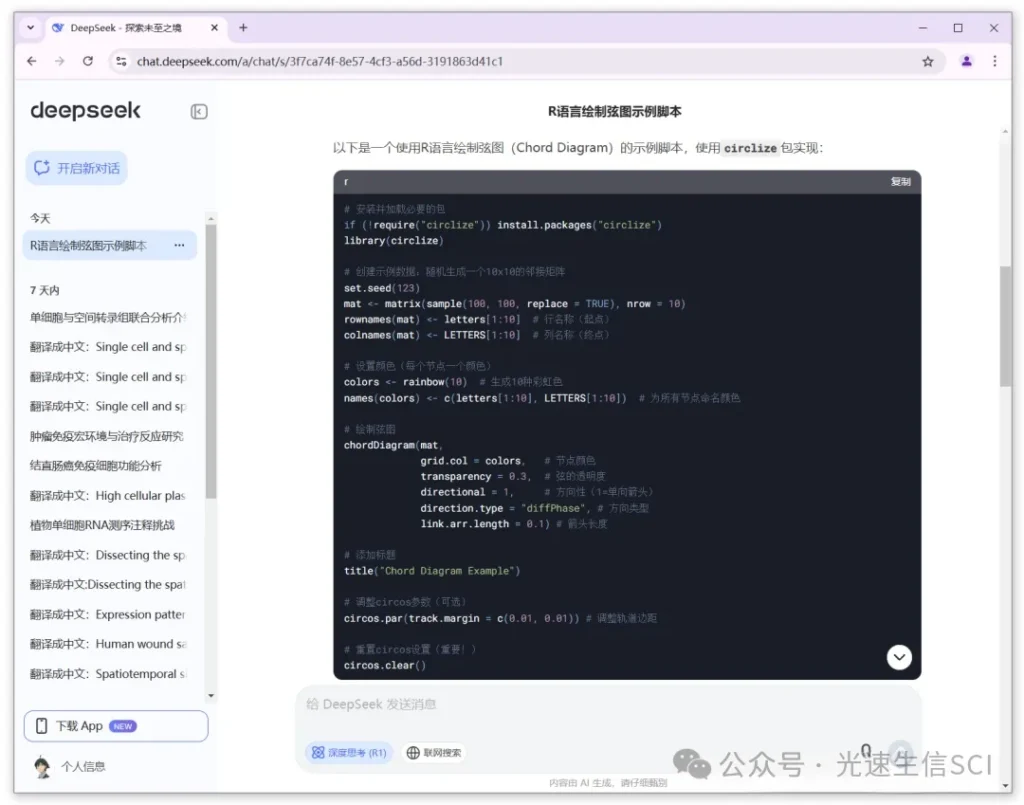 如今Deepseek被普遍使用,但若读者群体对R语言掌握有限,如何运用时下流行的智能工具DeepSeek辅助完成可视化任务?实际可采取人机协作模式:借助DeepSeek的智能编码功能输出基础脚本,随后在RStudio环境中进行调试优化与可视化呈现。